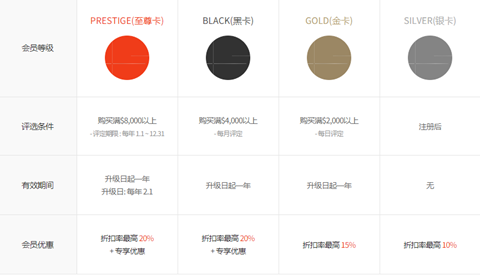 至尊卡以每年1月1日到12月31日网上以及实体店付款金额应领取商品为准,进行评定后个别告知。新等级将于2月1日起生效。