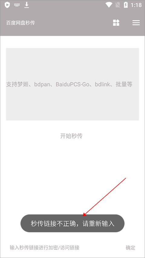 2、输入秒传链接(注意格式必须正确,否则会报错)。例如百度网盘的秒传链接格式通常为:128位(32个十六进制数)+#+128位(32个十六进制数)+#+一段数字+#+文件名。