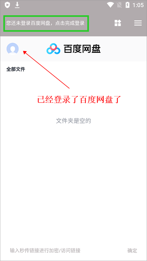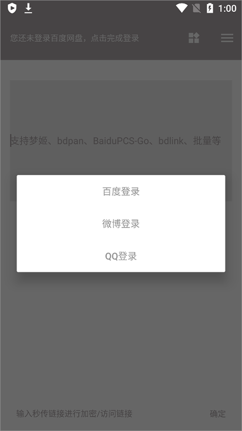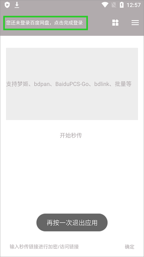 1、打开狐悠秒链App前,请确保手机上已安装并登录百度网盘App,因为狐悠秒链需要调用百度网盘的登录状态。