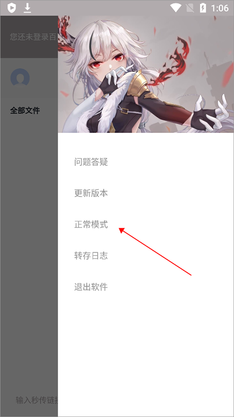 4、如果已登录百度网盘但App仍无法识别,可点击页面右上角的扩展菜单,在弹出的选项中选择【正常模式】。