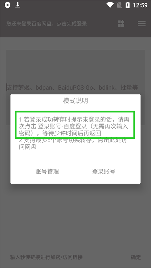 2、启动狐悠秒链后,若检测到未登录百度网盘,系统会提示登录;若已登录百度网盘但仍有提示,请点击提示框中的“登录账号”进行授权(二次登录无需重复输入密码)。