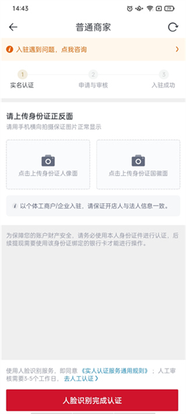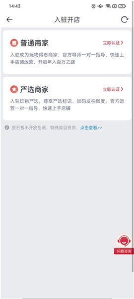2、点击右下角的“我的”,找到“商家入驻”,选择普通商家或严选商家,点击“立即认证”。