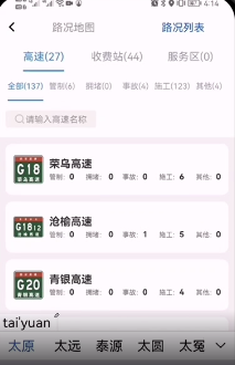 第二步:进入路况列表界面,根据需要点击”高速“、”收费站“或”服务区“;