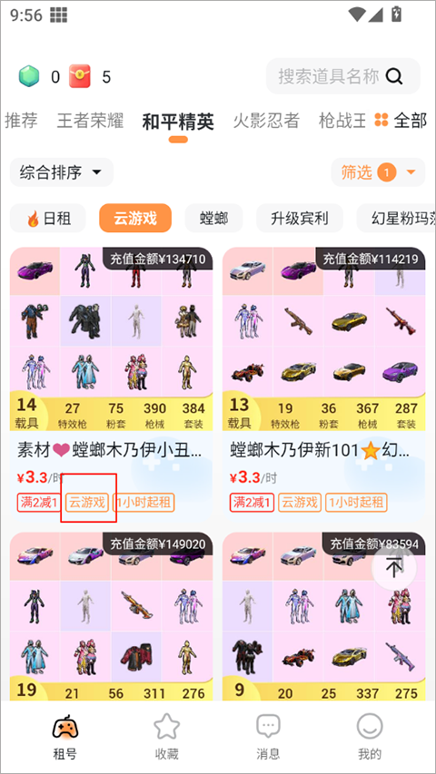 【特点】账号列表中带“云游戏”标签,目前平台仅《和平精英》部分账号支持云游戏;