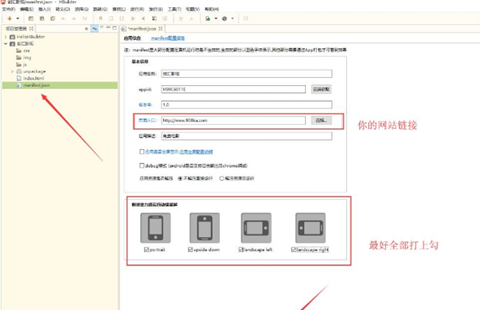 五、“页面入口”填写网页地址..也可以填写本地网页文件(注意打包时一起带上) – “应用描述”可以随便填 – “根据重力感应自动横竖屏”这个最好全部勾上