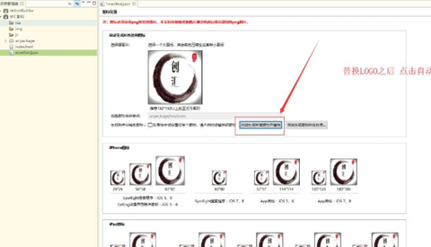 六、点击下方“图标配置” – “选择图标”(256*256或更小) – “自动生成所有图标并替换”