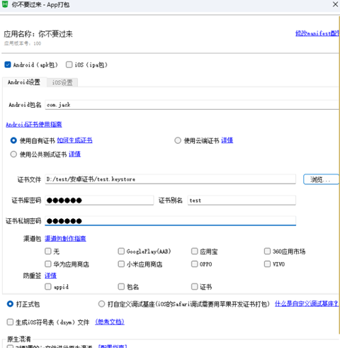 九、” ..ios的也可以一起勾上 – “Android包名”开始打包