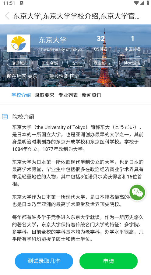 4、点开一个学校,你可以查看学习详细信息,你可以测试录取几率和申请;