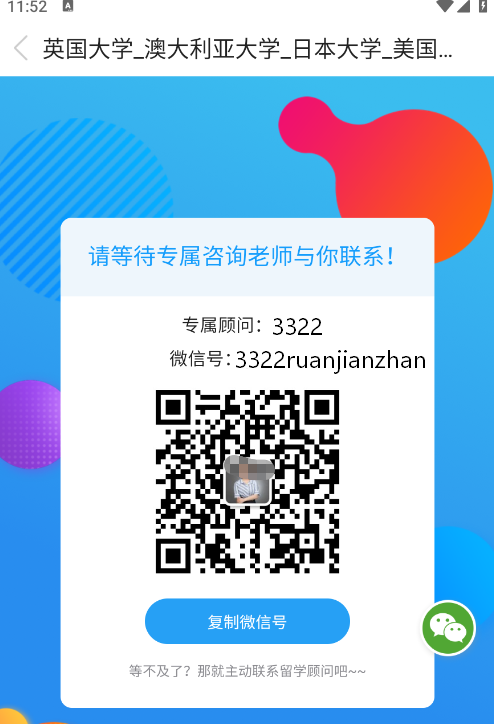 5、点击申请后,会提供一个老师的微信号让你详细咨询。