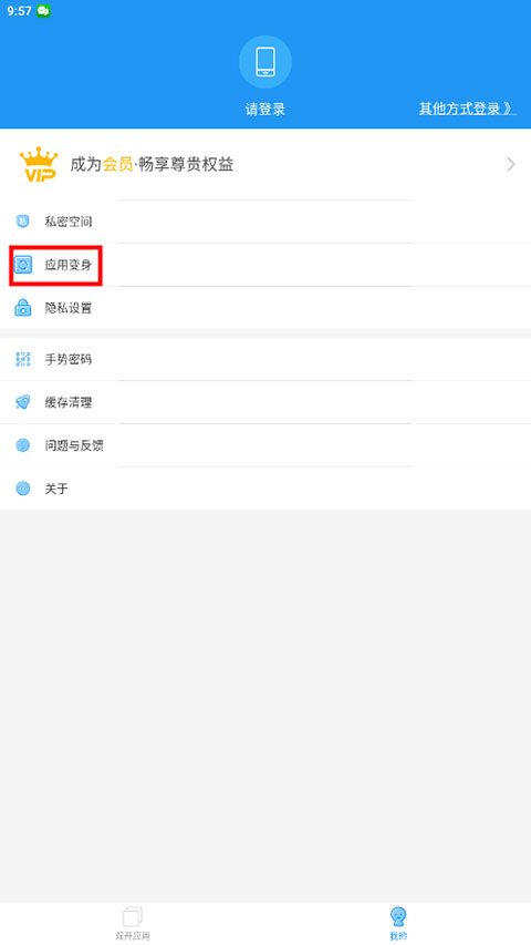 1、在“我的”页面,点击“应用变身”;
