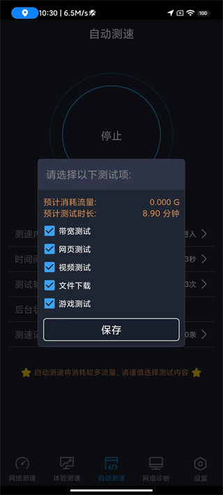 在自动测速功能中,我们可以选择进行宽带测试、网页测试、视频测试、文件下载、游戏测试多个项目,后台会给出预计消耗流量和所用时间数据,使用宽带测速时,预计消耗流量会显示为 0,如果使用移动数据,则会显示为真实的消耗量。以我这次测试为例,显示为 1.5G,如果流量不多的话建议少测试。在底部,其实 APP 也进行了提醒 " 自动测速将消耗较多流量,请谨慎选择测试内容 "。