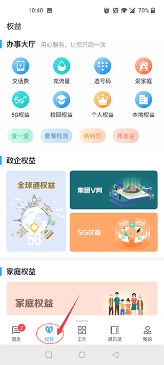 2、我们也可以点击下方的权益,里面有大量便民服务。
