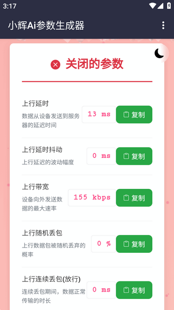 小辉Ai参数是一款基于先进AI算法的智能化参数配置软件,专为优化弱网环境下的应用体验设计。通过实时解构复杂场景、精准定位用户画像及网络状态,该工具可自动生成适配个人设备与网络环境的最优弱网参数建议,支持多AI引擎与多场景自由切换,覆盖游戏、视频、通讯等全业务场景,它依托高实时性数据分析能力,动态输出适配当前网络质量的配置参数,降低延迟与丢包率,支持一键复制参数至设置工具,历史记录自动保存并可一键复用,避免重复测试,支持多场景、多档位参数自由调整,满足个性化需求。