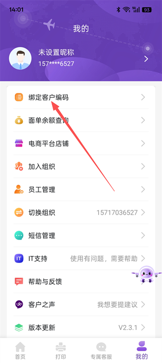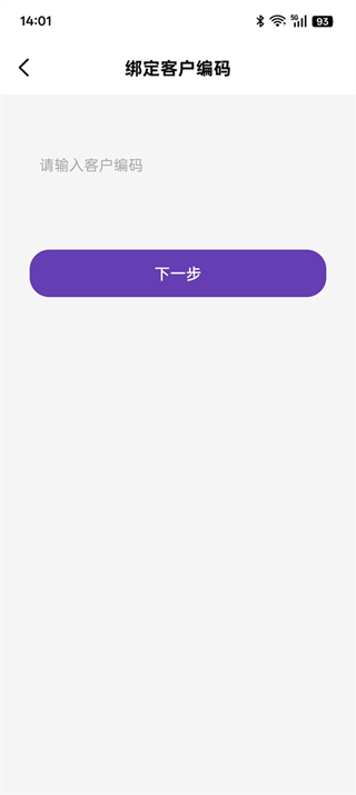 客户管家手机APP端:我的-绑定客户编码,点击绑定客户编码按钮绑定