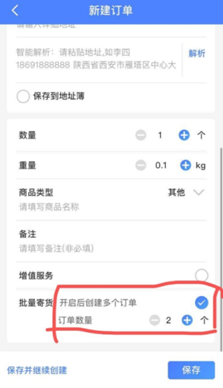 2、勾选批量寄货,需要拆分成几单就添加数字为几。