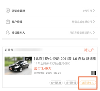 8、付款后,用户可在app内查看车辆交易进度,完成过户后,交付经理会联系用户到场提车,如果本人无法到场的话,可以设置选择授权提车人,提车人携带证件到场提车即可
