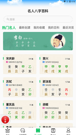 4、还打造了全球最大的名人八字数据库,历史名人的八字都能查到,利于学习研究。