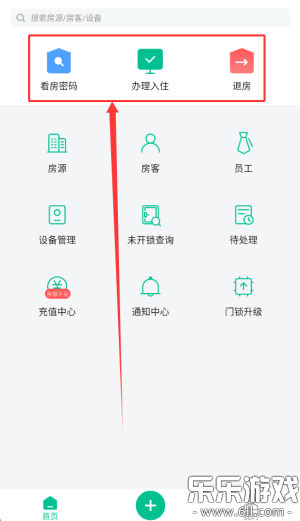 3、首页提供查看房源密码、在线办理入住与退房手续等主要住宿管理功能。