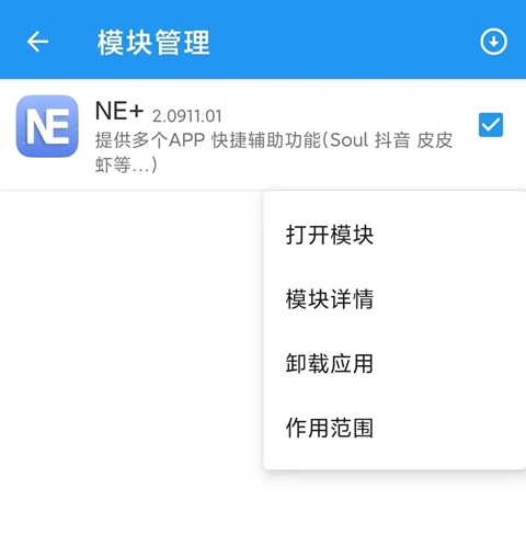 2、模块的使用方式与LSPosed、EdXPosed等类似。下载好模块后,进入「模块管理」页面,勾选需要的模块。勾选后重启分身软件,即可生效!