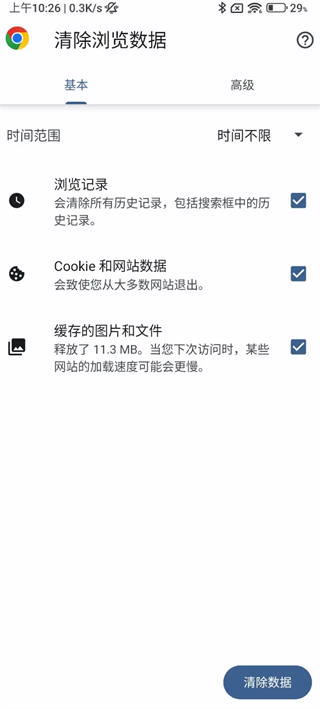 3、最后点击清除浏览数据,其中就包括了缓存内容。