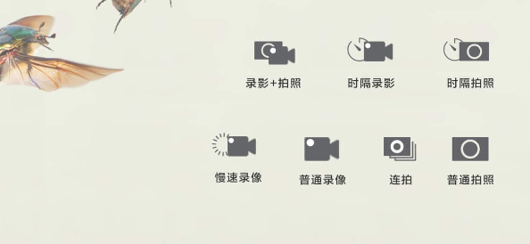 录影、拍照、时隔录影、时隔拍照、慢速录像、普通录像、连拍、普通拍照