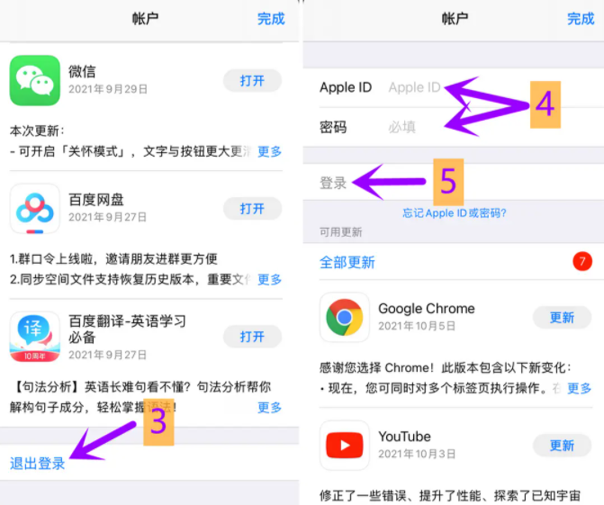 2.往下翻,找到退出账号选项,点击(退出账号)。然后输入海外苹果id账号,点击(登录)。
