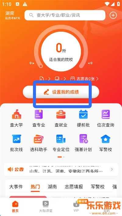 1、打开载望志愿App,进入【首页】,点击【设置我的成绩】;