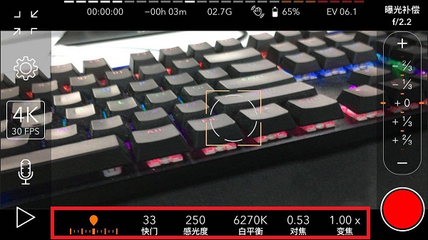 3、如图,在下面一栏中,包括快门、感光、白平衡、对焦、变焦等参数,我们可以选择更改调用,