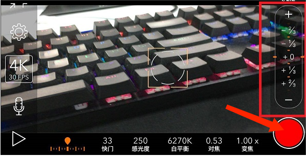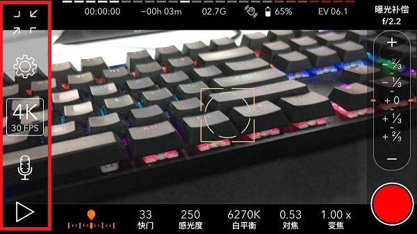 2、进入拍摄界面,包括缩放屏幕、设置、4k30fps、录音和播放等选项,用户可根据需求选择使用,