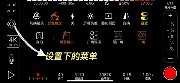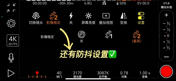 设置菜单里可以切换镜头还有防抖级别可供选择!想要画面保持聚焦的话还可以进行曝光锁定~