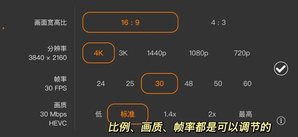 若在编辑已拍摄的素材时,原始素材本身不是4K分辨率,ProMovie可能会根据素材质量自动调整可用参数,隐藏4K选项。