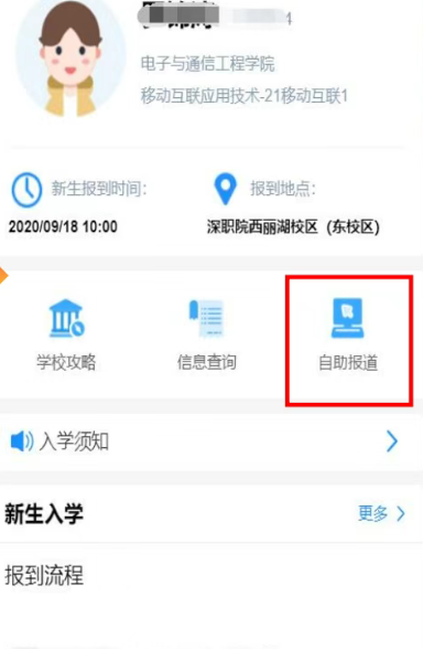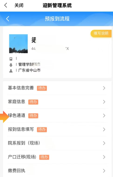 学生在未到校之前进行预报到,系统自助报到环节有:基本信息完善、家庭信息、绿色通道、报到信息填写四个,各环节为非必到现场的都可以在线上根据学生实际情况填写(例如申请各类贷款的需要走绿色通道环节,提交申请),填写完成点击“提交”即完成预报到环节。