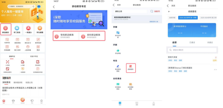 点击“移动教务”,进入后选择“专科移动教务”或“本科移动教务”进入并点击“成绩查询”,成绩查询页面示例。
