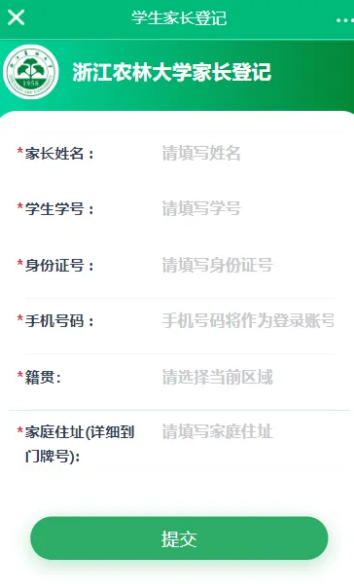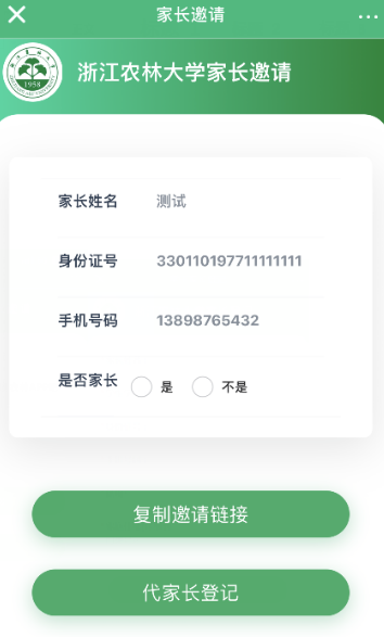 学生在智慧浙农林app里搜索“邀请家长”,打开“邀请家长”应用,可以将邀请链接复制发给家长,家长可在手机上直接点击邀请链接打开,或者学生代家长登记,就可以在app里直接登记。