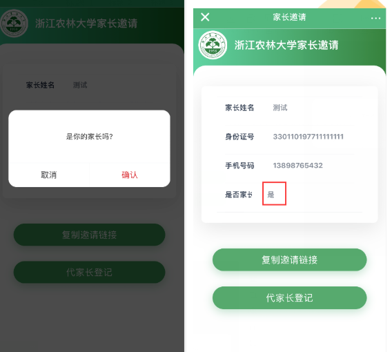 家长登记好后,学生回到智慧浙农林APP的“邀请家长”应用,会显示有人想要绑定自己,可以选择“是”或“不是”来审核。