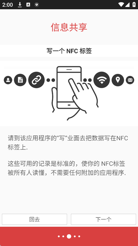 进入应用“写”页面,将数据写入标签;写入的记录为标准格式,其他设备无需额外应用即可直接读取。