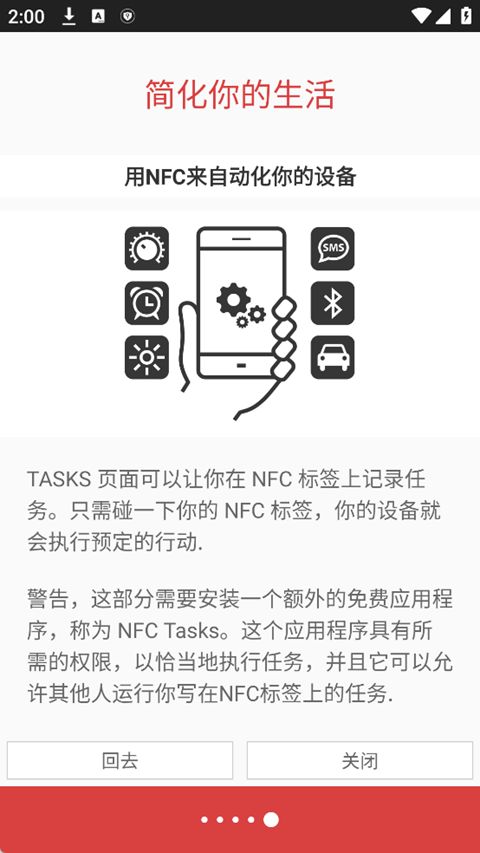 进入“TASKS” 页面,将预设任务(如开启蓝牙、发送短信等)写入标签;触碰标签后,设备会自动执行任务。此功能需额外安装免费应用“NFC Tasks”以获取执行权限,且支持他人运行标签中的任务。