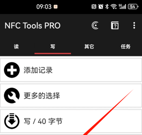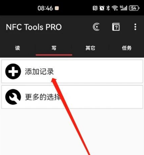1、打开手机NFC功能,然后打开刚刚下载的NFC Tools PRO,然后切换到写,点击添加记录。