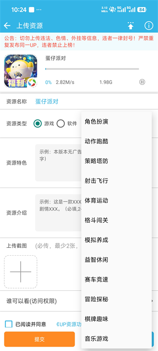 5、随后上方会看到在上传,选择游戏分类