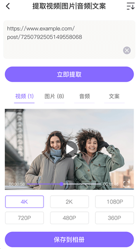 支持抖音、快手、西瓜视频、YouTube、哔哩哔哩等主流视频平台,以及微博、Instagram等图片平台,可一键下载视频和图片资源。