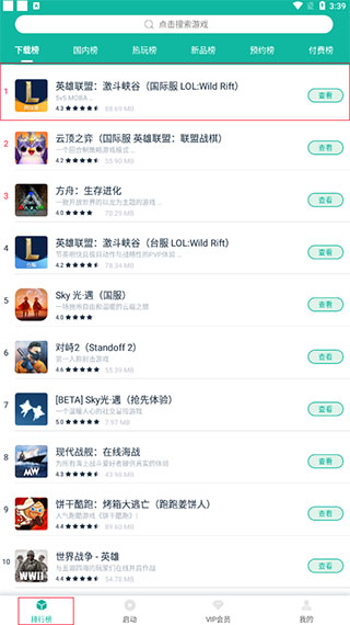在谷歌空间首页当中,你将可以看到热门手游实时排行,以下载榜、国内榜、热玩榜以此排列出来。