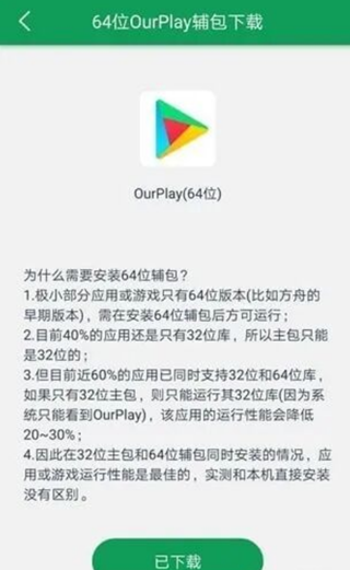 部分游戏及应用需要安装64位辅包才可以流畅运行。所以,为了保证在OurPlay下载的所有游戏及应用达到最佳的运行性能,建议你在进行完上述安装后,前往【我的】-【设置】-【64位OurPlay辅包下载】下载辅包。