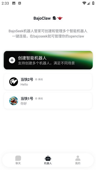 2、机器人:创建智能机器人以满足不同的需求场景。BajoSeek机器人管家可创建和管理多个智能机器人一件链接,在BajoSeek就可管理你的openclaw。