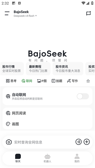 1、打开BajoSeek App,在聊天页输入你的问题。BajoSeek更加擅长处理实时性比较强的问题,比如咨询今日热搜、全球实时股票、今日热门比赛、今日股市重大消息、实时汇率与金价、今日电影实时票房、实时金龙指数、NBA积分榜等实时类问题。