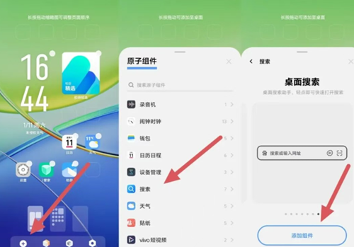 在桌面设置中查找“组件管理”或“原子组件”相关选项,进入后找到“搜索”组件并添加。