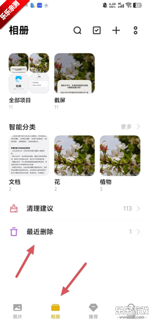 2、在app下方导航栏中,切换到“相册”一栏,下滑找到“最近删除”选项点击进入,如上图所示;