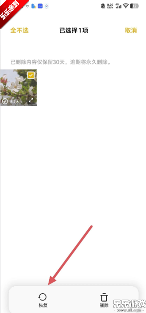 3、在“最近删除”页面下,找到刚删除的图片,长按选中,就会看到下方的“恢复”和“删除”两个按钮,点击恢复按钮,弹出一个“确定恢复全部选项吗?”的提示框,继续点击“恢复”按钮,回到相册照片页面,就可以看到刚刚删掉的照片找回来了。