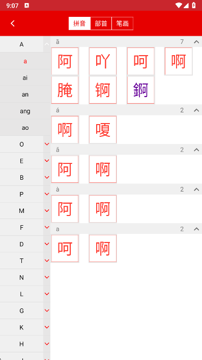 2、点击拼音, 可以浏览到所有的拼音音节