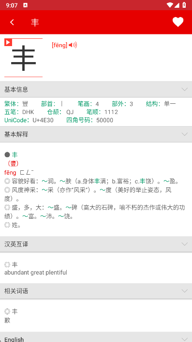 基本解释、English、汉英互译、相关词语、详细解释这些条目为可折叠设计。