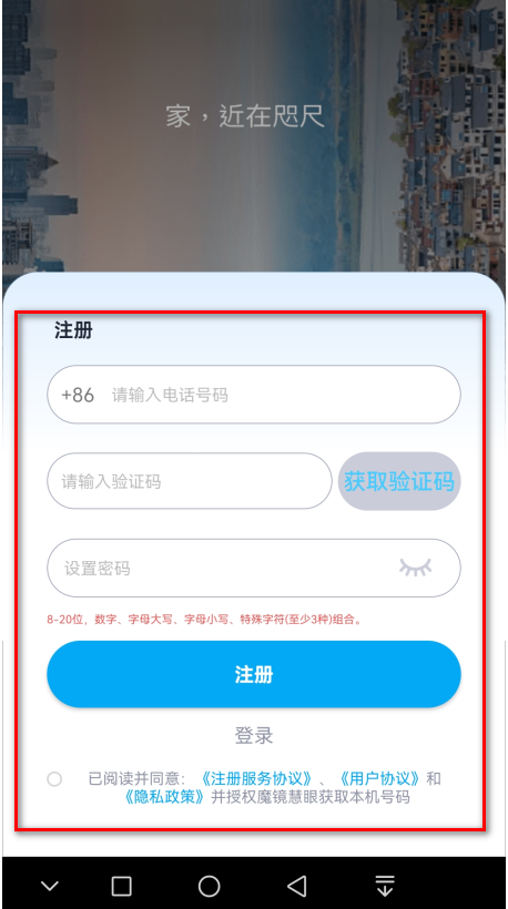 2.在注册界面输入自己的电话号码、验证码,设置密码(重点注意密码是8-20位,数字、字母大写、字母小写、特殊字符等至少3种组合),然后勾选已阅读并同意:《注册服务协议》、《用户协议》和《隐私政策》并授权魔镜慧眼获取本机号码,再点击注册。
